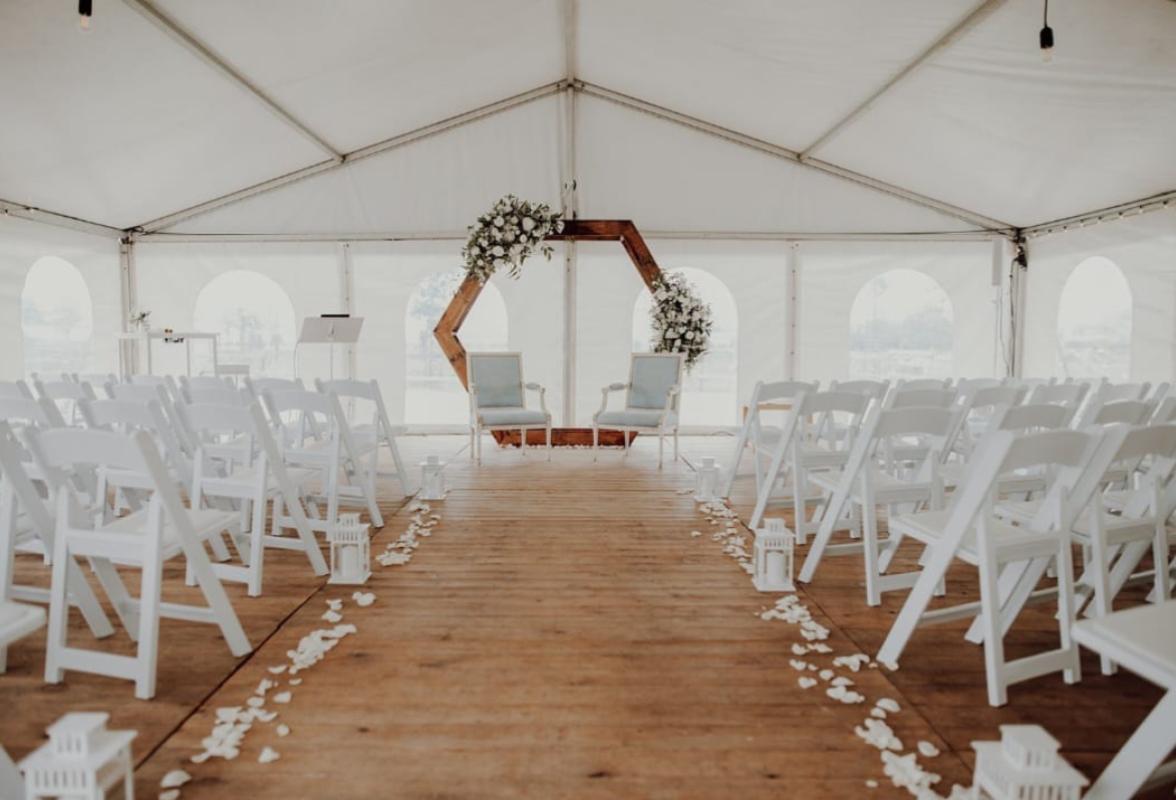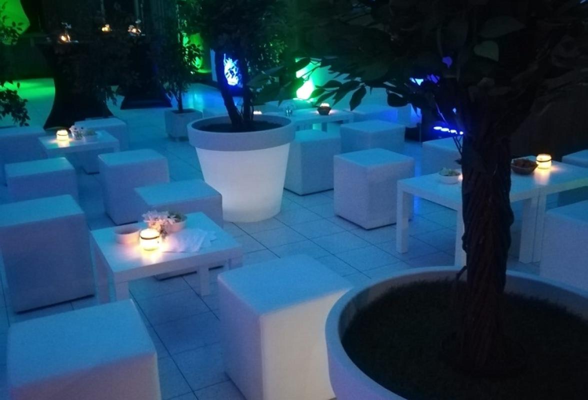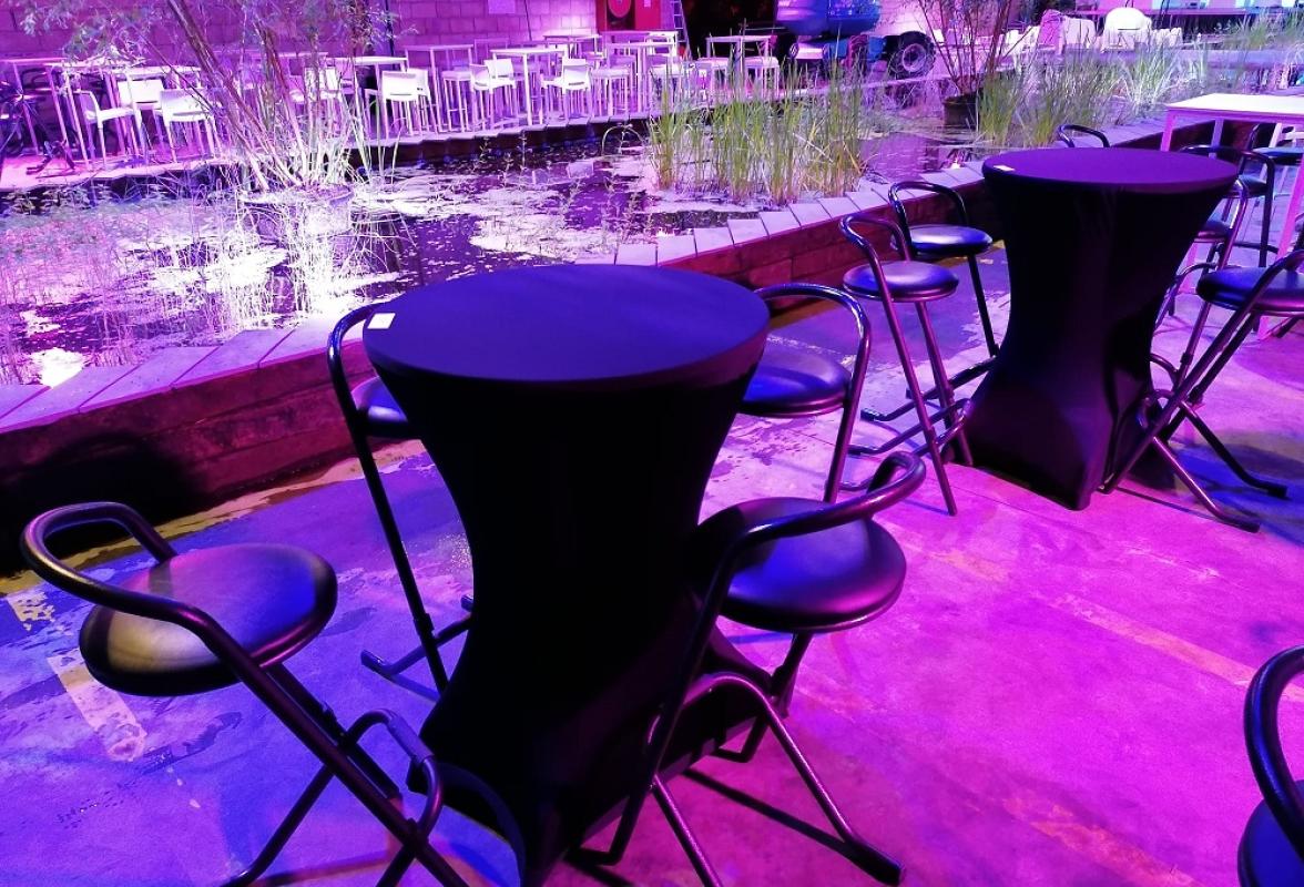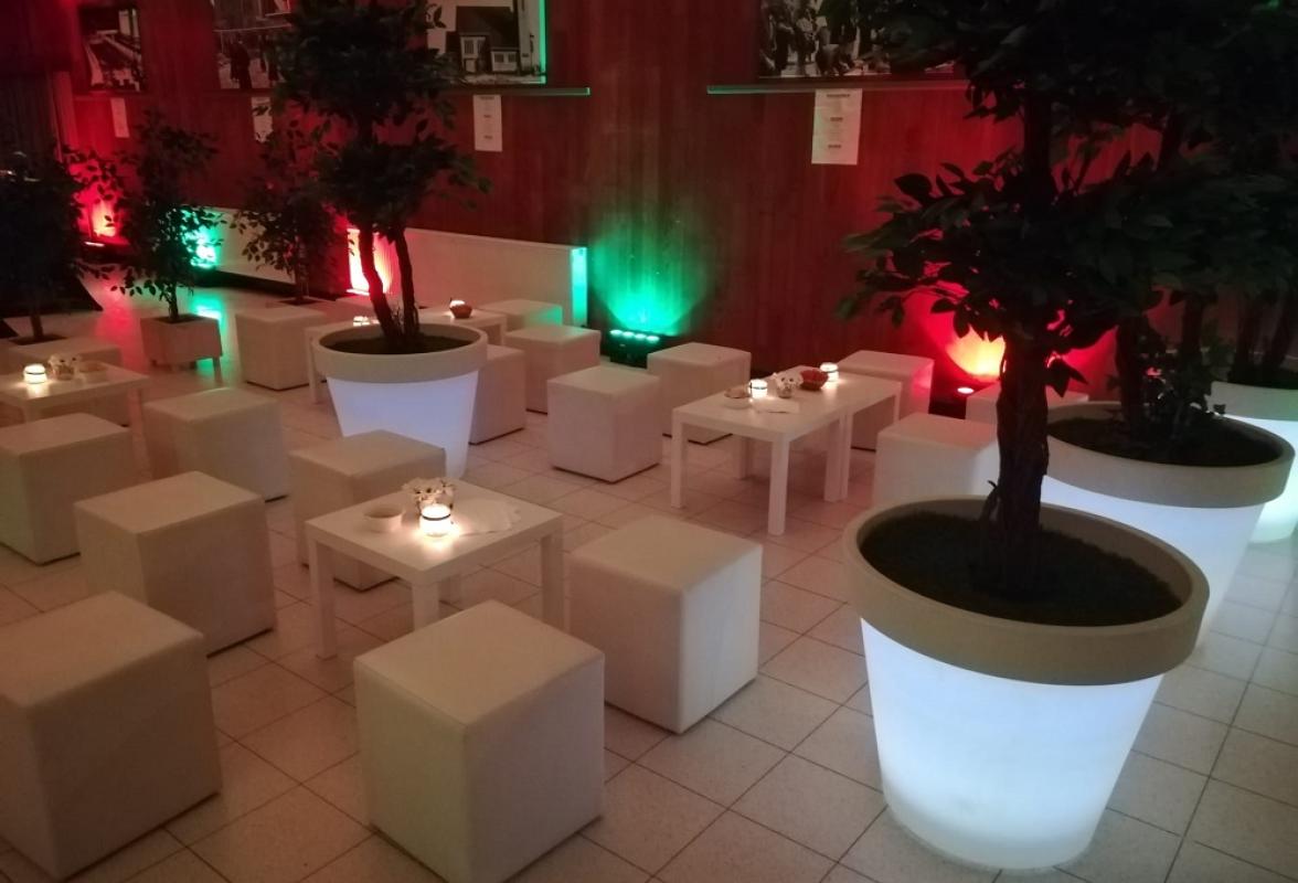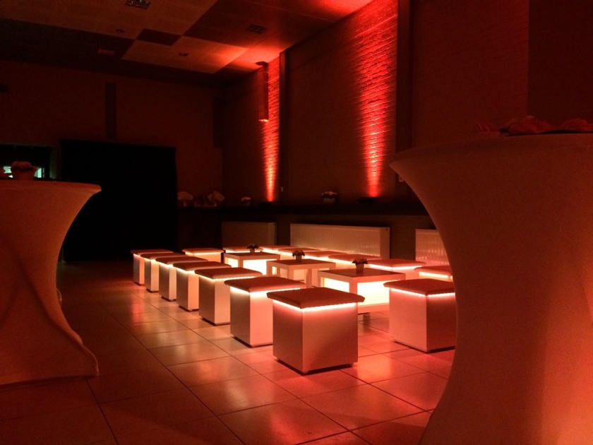 barmeubels, champagne-emmers, koelers, bloempotten, planten, verlichte kolommen, sfeerschermen, lichtletters, trouwbogen, kapstoksystemen en verlichting.