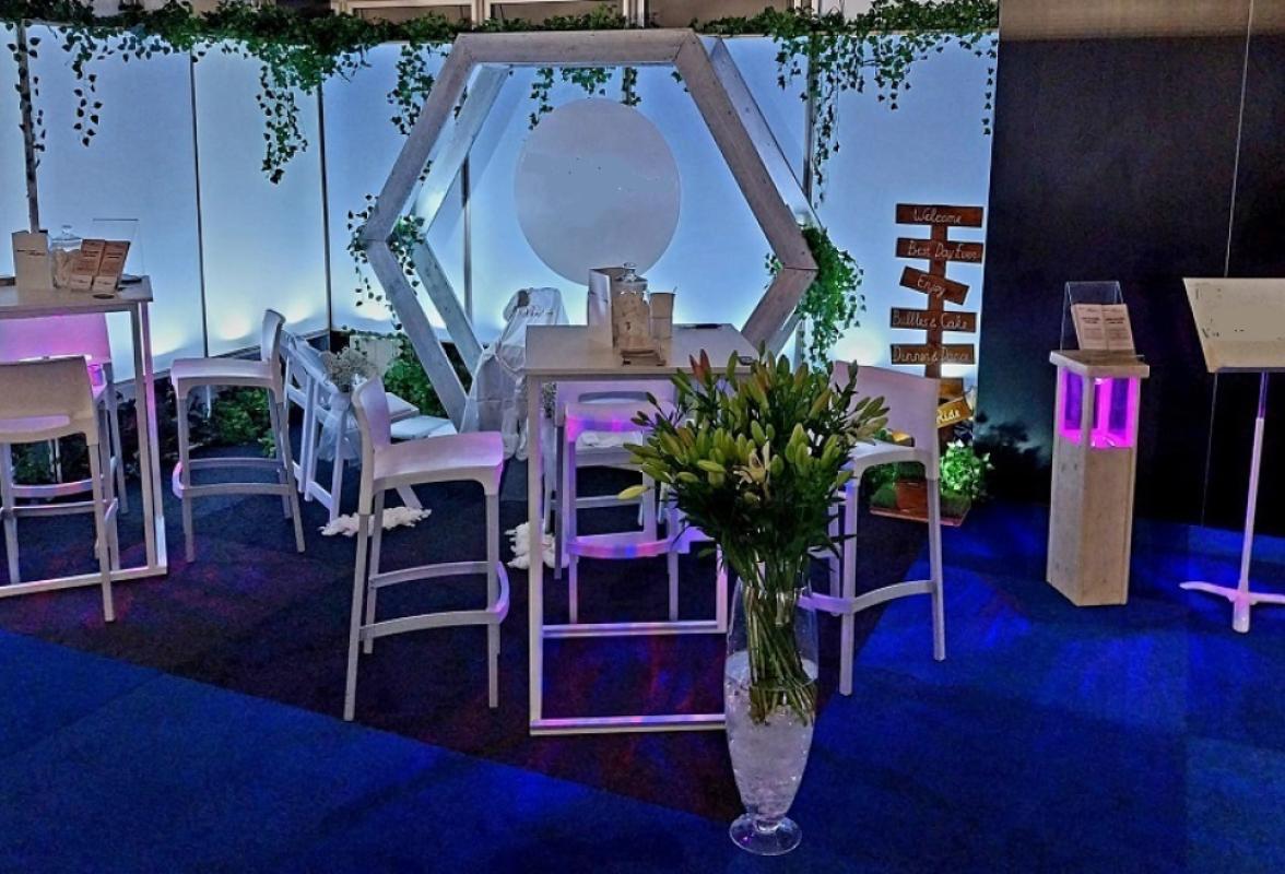 - Decoratie & aankleding: barmeubels, koelers, planten, verlichte kolommen, lichtletters, trouwbogen, sfeerschermen, wanden, kapstoksystemen, verlichting …