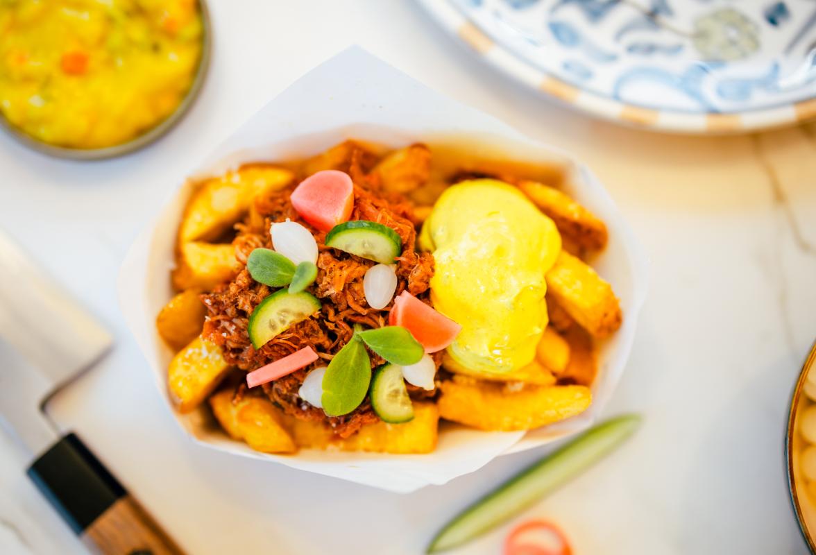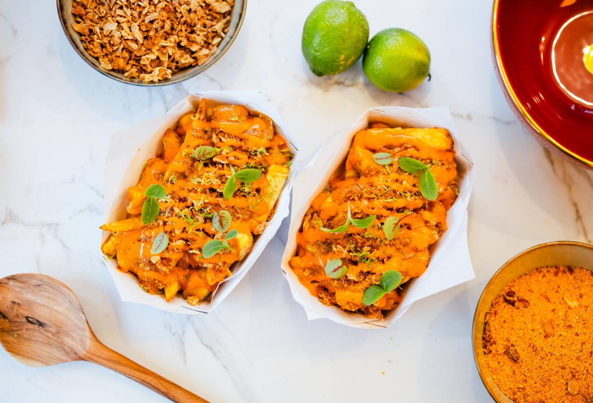- Ambachtelijk frites met Vlaamse stoverij, pulled pork, Indonesische pindasaus of vol au vent.